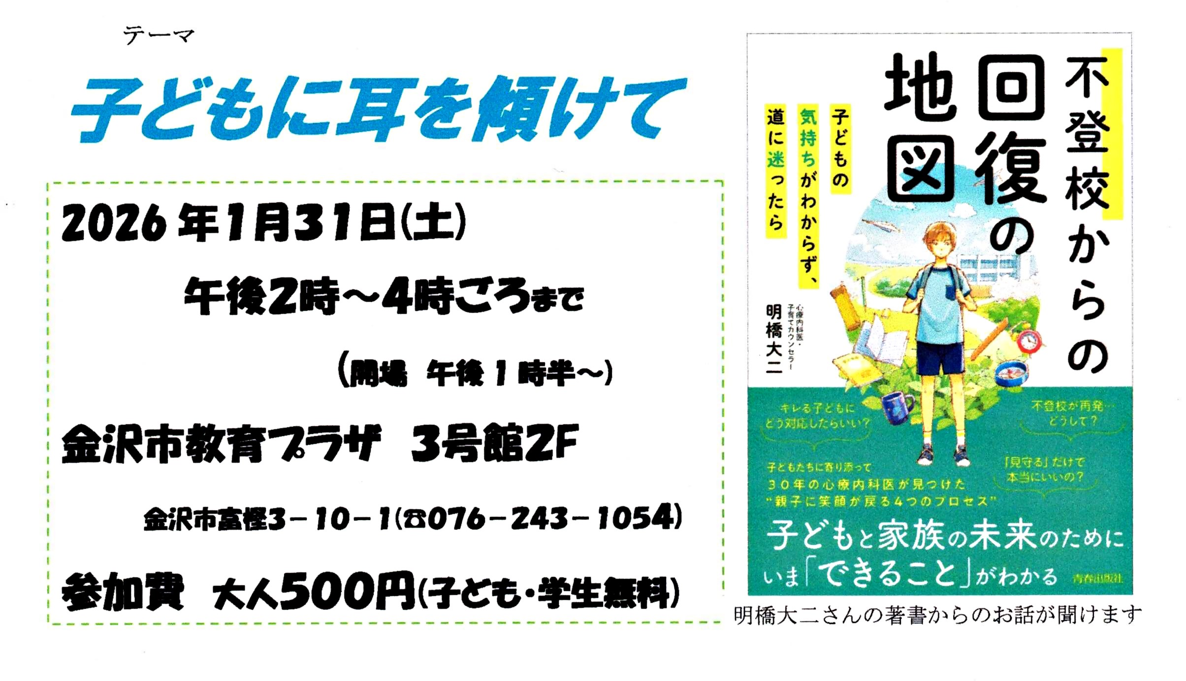 不登校や学校生活に悩む家族のための自助グループやすらぎの会、石川県BBS連盟共催の〜不登校と向き合う親子のための交流会〜「みんなで楽しいクリスマス会🤶🎄」を開催します😊学校 […]