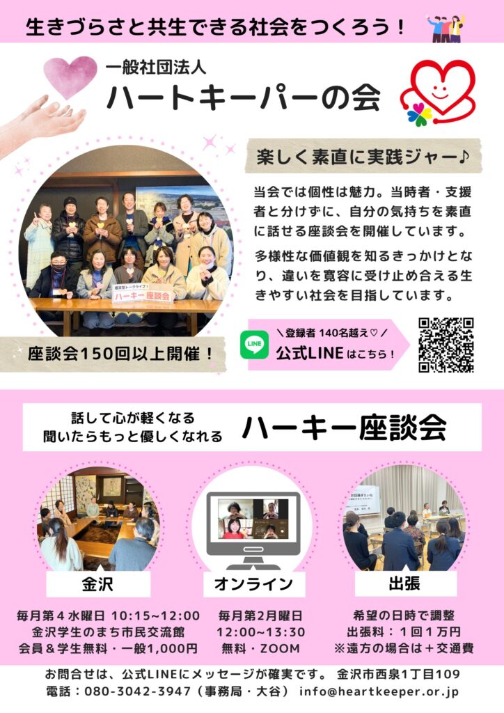 | 活動内容・対象 | ◆ハーキー座談会・金沢 日時:毎月第4水曜日10時15分〜12時 会場:金沢学生のまち市民交流館 参加費:会員&学生無料、一般1000円 ◆ハーキー座談会・Zoom 日時:毎月第2月曜日 12時〜13時30分 会場:Zoom 参加費無料 ◆出張:希望の日で調整。出張料1回1万円※遠方の場合は+交通費 会員募集中! 賛助会員になってハートキーパーの会を応援しませんか? |