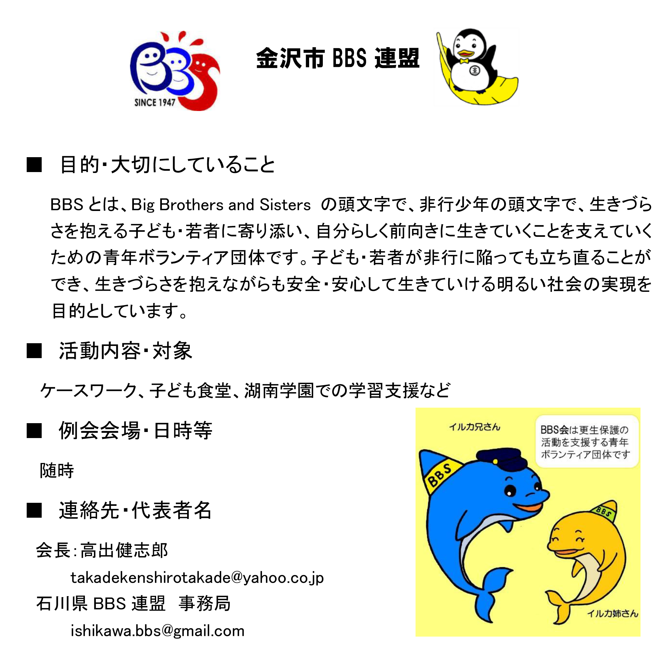 | 連絡先・代表者名 | ~高出健志郎(会長) ~事務局(石川県BBS連盟) |