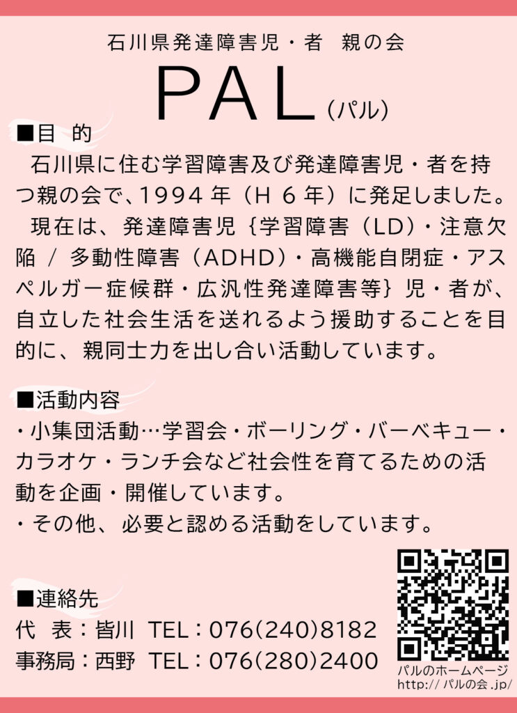 | 連絡先・代表者名 | 代表:皆川 TEL 076-240-8182 事務局:西野 TEL 076-280-2400 ホームページ:パルの会 メールでのお問い合わせはこちら |