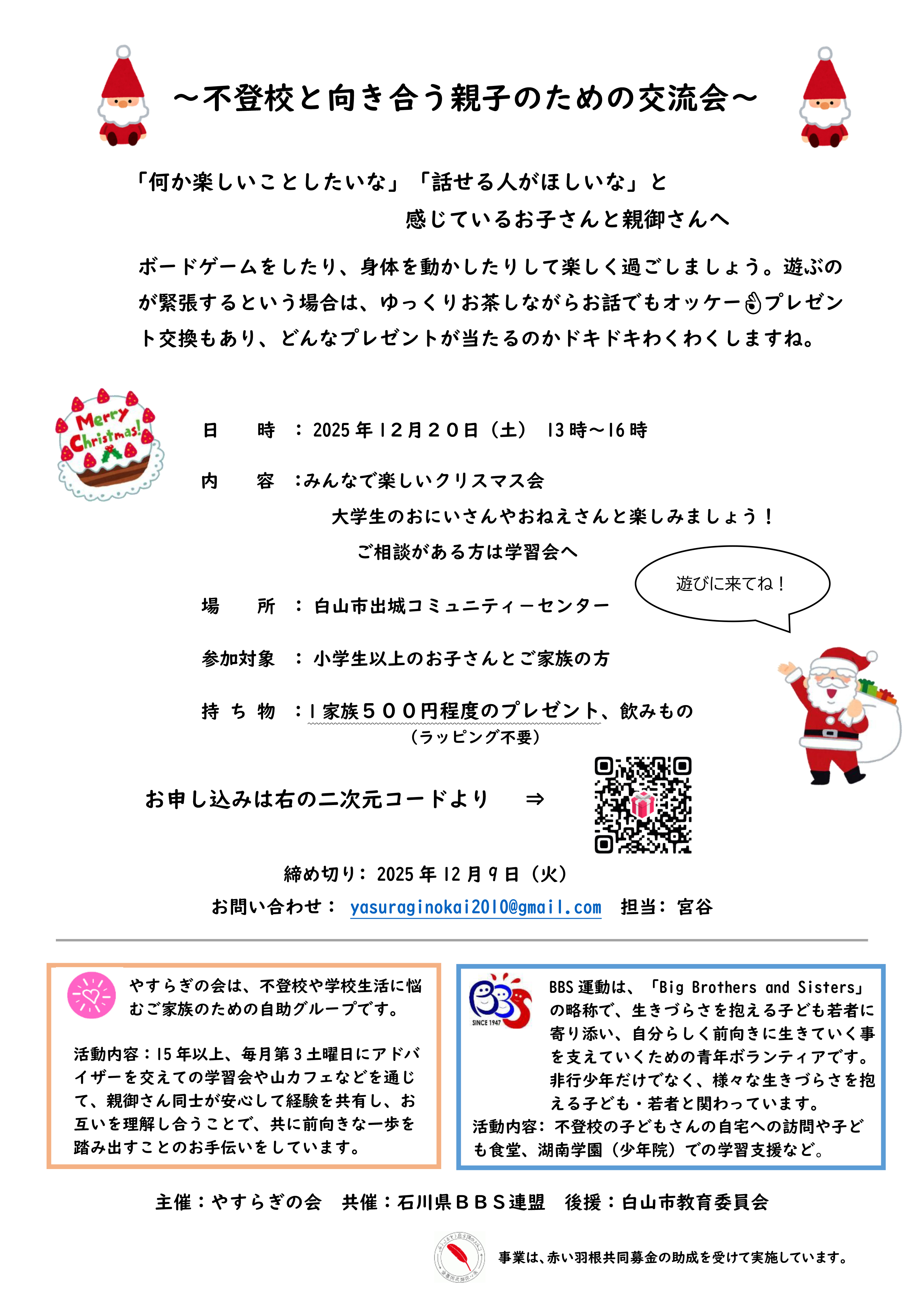 イベント【2025年12月20日(日)】〜不登校と向き合う親子のための交流会〜みんなで楽しいクリスマス会/やすらぎの会