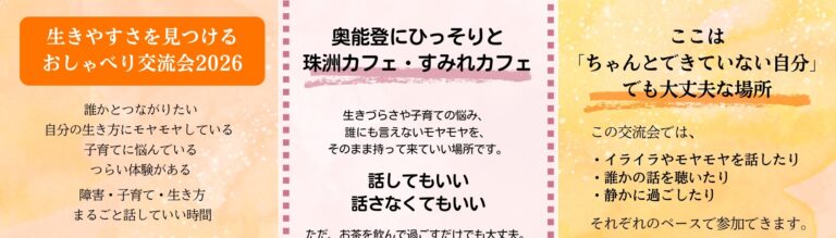 生きづらさを抱えている方が自由に話せる場所が奥能登にあります。 学校にいけない、働けない、自分に自信がない、生きているのがつらいなど、誰にも言えないモヤモヤを軽くするために、誰かとつながってみませんか。 今回、「珠洲カ […] -